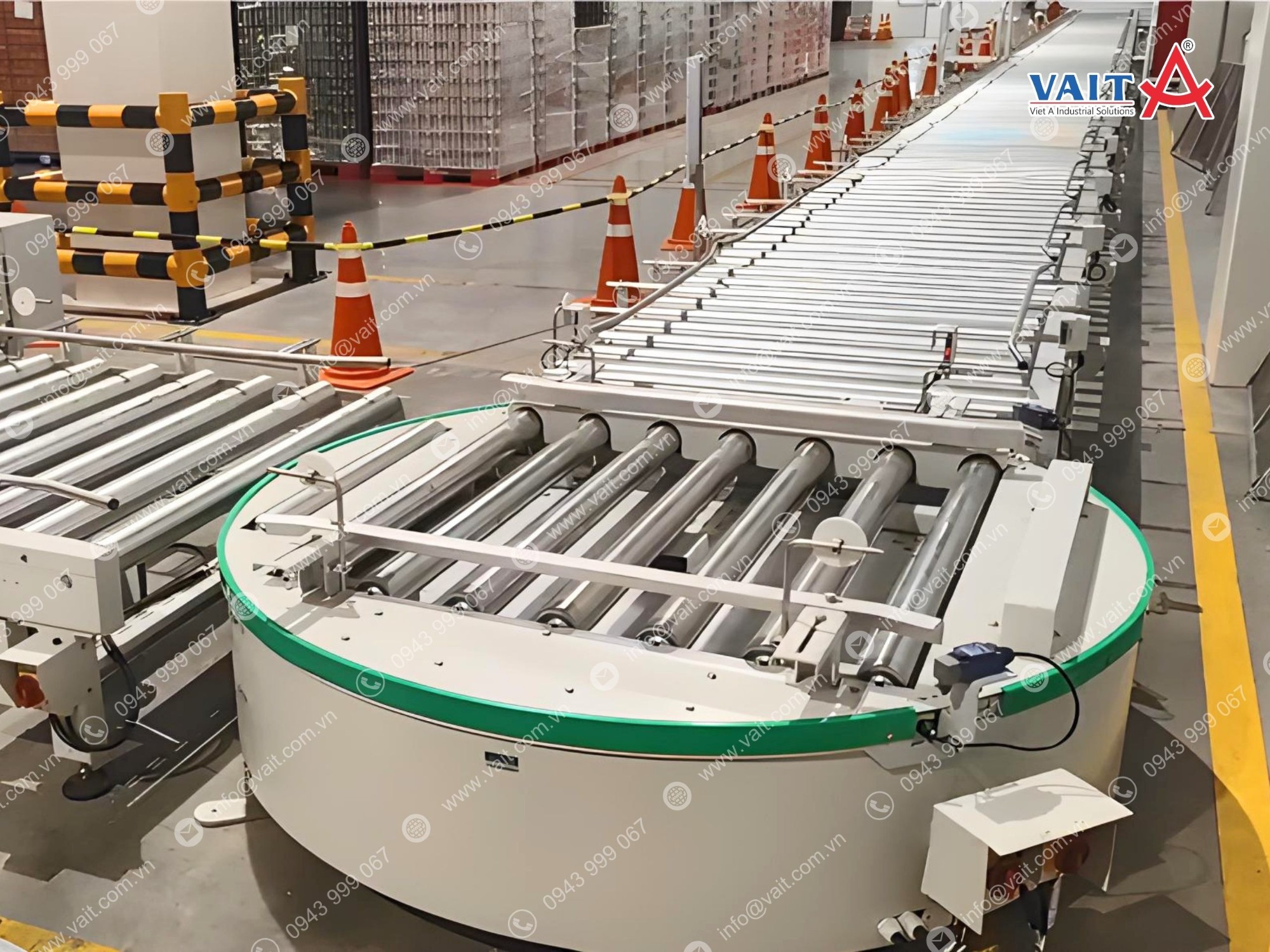 Băng tải bàn xoay con lăn là thiết bị băng tải được thiết kế có khả năng xoay linh hoạt từ 90° đến 360°, giải pháp chuyển hướng hàng hoá đa chiều giúp đổi hướng sản phẩm một cách nhanh chóng và chính xác trong dây chuyền sản xuất.